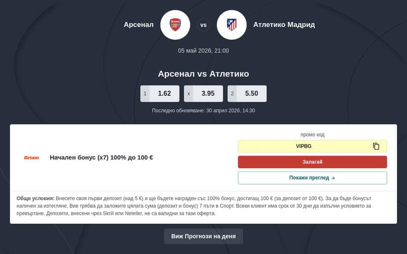 Арсенал vs Атлетико прогноза привлича сериозен интерес сред феновете и любителите на залози на Арсенал - Атлетико преди този сблъсък от Шампионската лига, който ще се играе на 05.05.2026 от 21:00 часа. Двата отбора имат различен стил, но сходно високо ниво, което прави срещата изключително трудна за предвиждане. По последни данни от водещи оператори като bet365, Betano и Mr Bit, коефициентите вече са налични и показват леко предимство за Арсенал, но разликите са минимални. Това означава, че залози за Арсенал - Атлетико могат да се разглеждат от различни ъгли, а не само през крайния изход. Коефициентите са: за Арсенал – 1.62, за равенство – 3.95, а за Атлетико – 5.50.