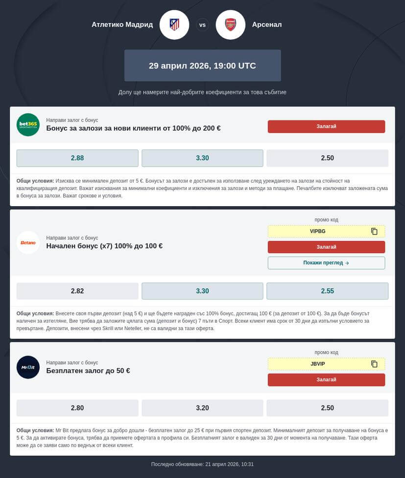 Срещата между Атлетико и Арсенал е част от елиминационна фаза в UEFA Champions League, което автоматично променя начина, по който трябва да гледате на коефициентите. Събитието ще се проведе в сряда, на 29.04.2026, в 21:00 часа (българско време) на Естадио Метрополитано.