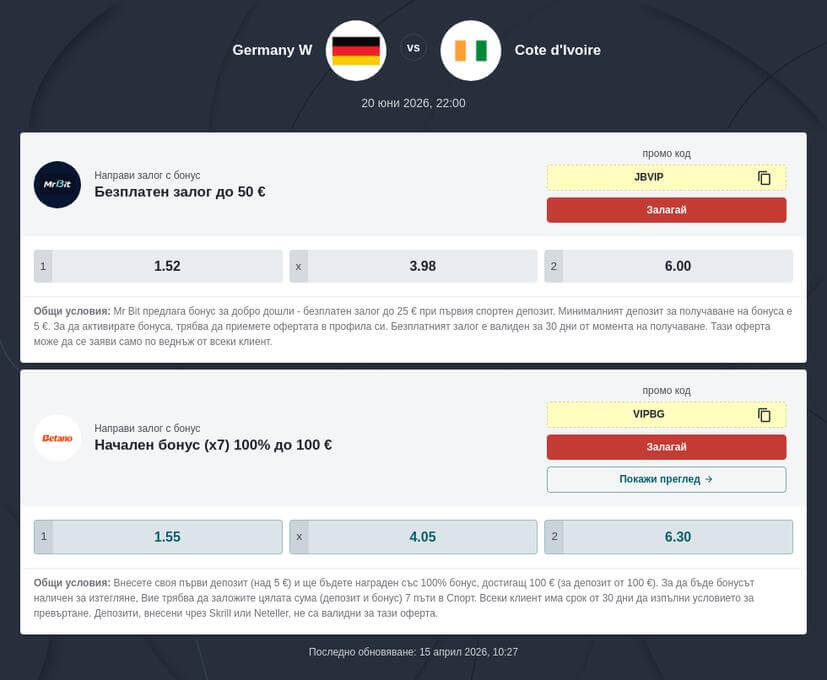 Най-добрите Германия vs Кот д'Ивоар коефициенти за залози обикновено са налични в bet365, Betano и Mr Bit, като е препоръчително да се сравняват преди поставяне на залог.