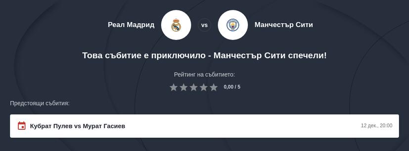 Срещата Реал Мадрид vs Ман Сити е част от Шампионската лига и ще се играе на Естадио Сантяго Бернабеу в Мадрид. Според данните от Sofascore, мачът е насрочен за 10.12.2025 г., като началният час ще бъде 22:00 ч. българско време.